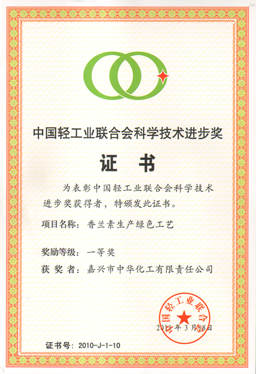 中華化工“香蘭素生產(chǎn)綠色工藝”獲部級科技進(jìn)步一等獎