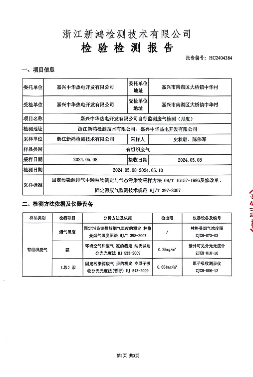 報告名稱(chēng):2024年中華熱電5月廢氣檢測報告