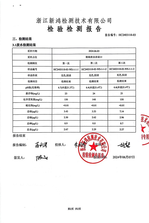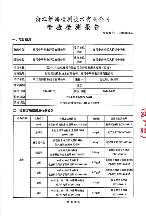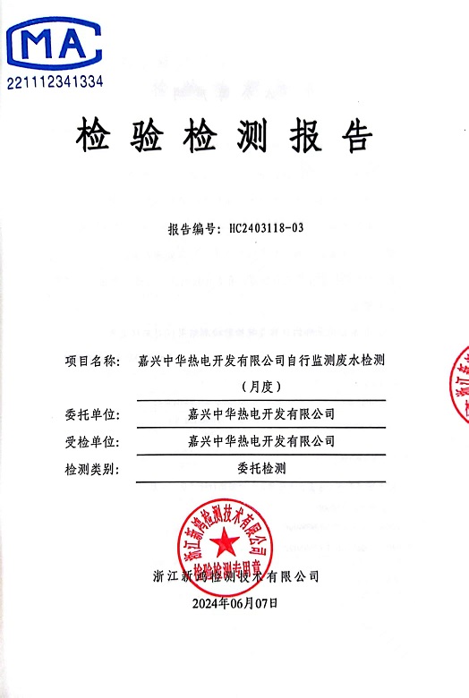 報告名稱(chēng):2024年中華熱電6月廢水檢測報告