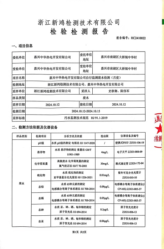 報告名稱(chēng):中華熱電10月廢水檢測報告