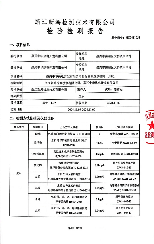 報告名稱(chēng):中華熱電11月廢水檢測報告