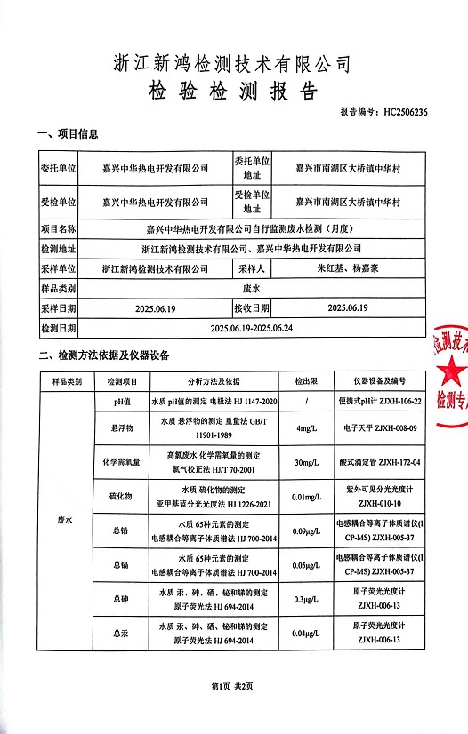 報告名稱(chēng):中華熱電6月廢水檢測報告